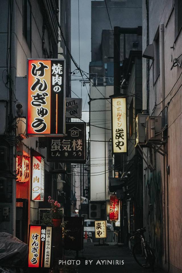 夜幕降临,沿街的霓虹灯一亮起来,旭川就换上了另一幅面孔,它有酒也有故事。