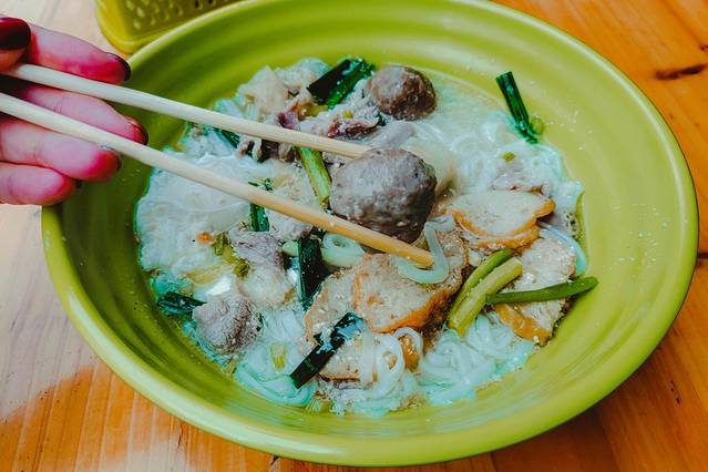 超豪华后安粉plus:后安粉+2颗牛丸+1份猪肉饼。因为第一天就点了这个超豪华版,以至于老板后来都记住了我了。汤底鲜美,内脏毫无腥味,粉质软糯,超级好消化,吃完元气满满一整天。