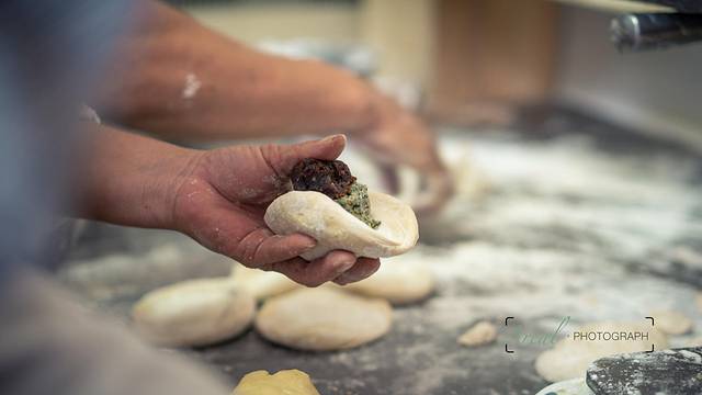 面团混合油酥,里面包裹荠菜、板油、白糖制成甜咸口味,纯甜味的则是豆沙馅。