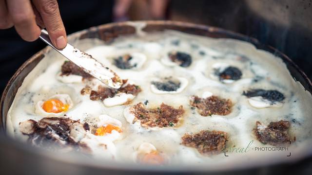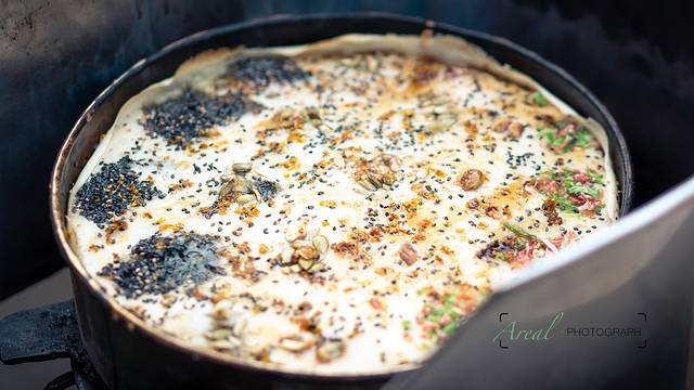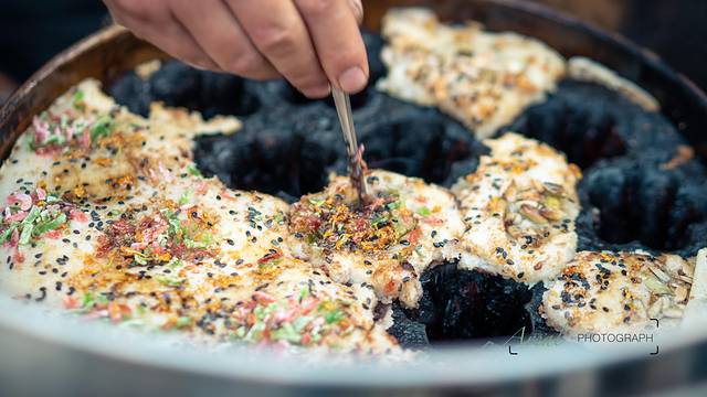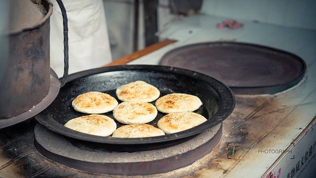 拖炉饼的烤制与其名字一致,炉灶上放置平底锅,上面架着一只尖型的顶炉,烘烤时两只炉同时加热,顶炉又能托起底炉,故称“拖炉饼”。制作好的拖炉饼,表皮焦酥,一碰便掉渣儿,来自猪板油与鲜荠菜双重加持,不用尝就已猜到香鲜满溢啦。