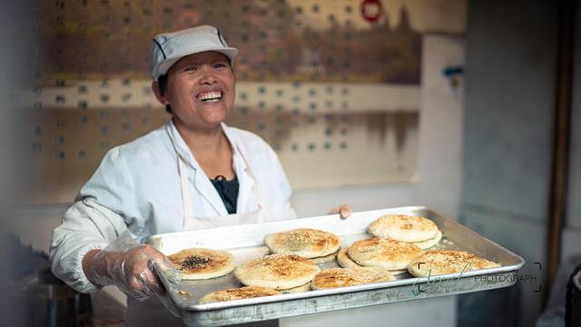 拖炉饼是地道的张家港小吃,在这条街上颇受欢迎。夫妻档的小店里,分工明确干活麻利。妻子在左边房间制作好饼坯子,拿到隔壁房间,丈夫负责烤制成品再端回来由妻子负责售卖,琴瑟和谐,莫不静好。