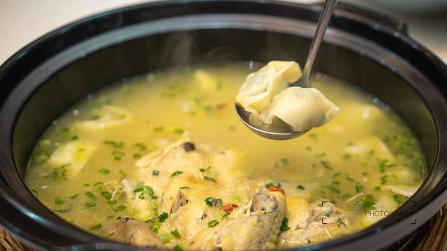 咸肉、蛋饺、蹄筋、鸡肉、炸鱼鲜的各有滋味又相得益彰。