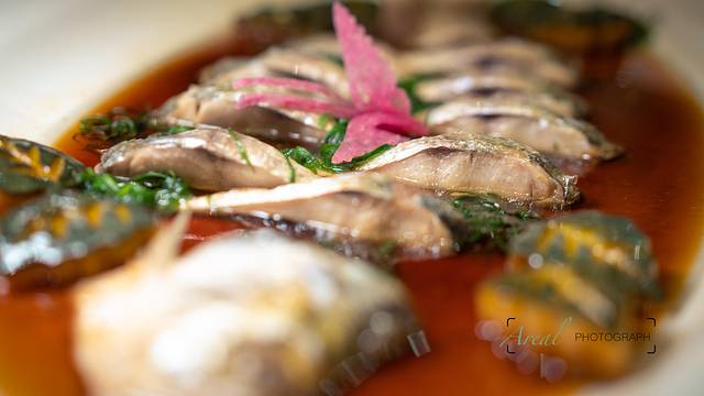 让我印象最深的是著名的江苏菜——红烧河豚老庙。河豚肉质鲜美丰腴,酱汁浓郁,草头吸饱精华,同样滋味十足。