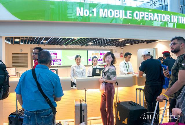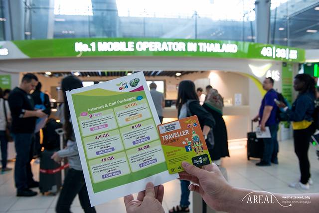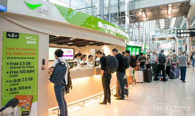 我在素万那普国际机场购买了AIS TRAVELLER SIM(AIS 旅行者SIM卡),专卖店在到达厅2楼的6号与7号门之间,绿色的门头很显眼。