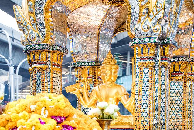 四面佛伫立在曼谷市中心,车水马龙的路口旁,周围便是商场、地铁,偏此一隅浓郁了整条街的香火弥漫。