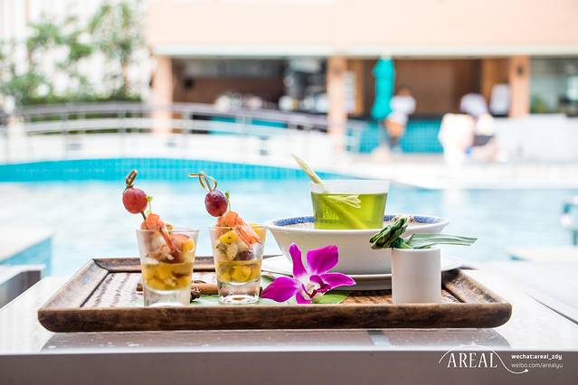 我们预订的是泳池房,果然,比想象中还要爽……推开落地窗就可以直接跳进酒店的泳池。房间里摆放着准备好的下午茶点。我俩把茶点端到外面,一人一个躺椅,面对泳池,静静享受,望着池水湛蓝,思绪远飘。