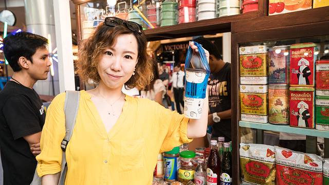 买了蛋黄酥和鱼鱼最爱的泰国奶茶。蛋黄酥在国内也常吃,这里的很特别!它竟然是带着烟熏味道的,如分子料理般让人惊叹。