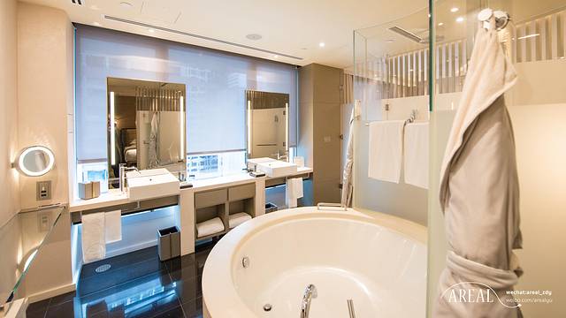 我入住的套房利用弧形设计的卫生间精妙地将空间划分,每个区域都有独立电视。