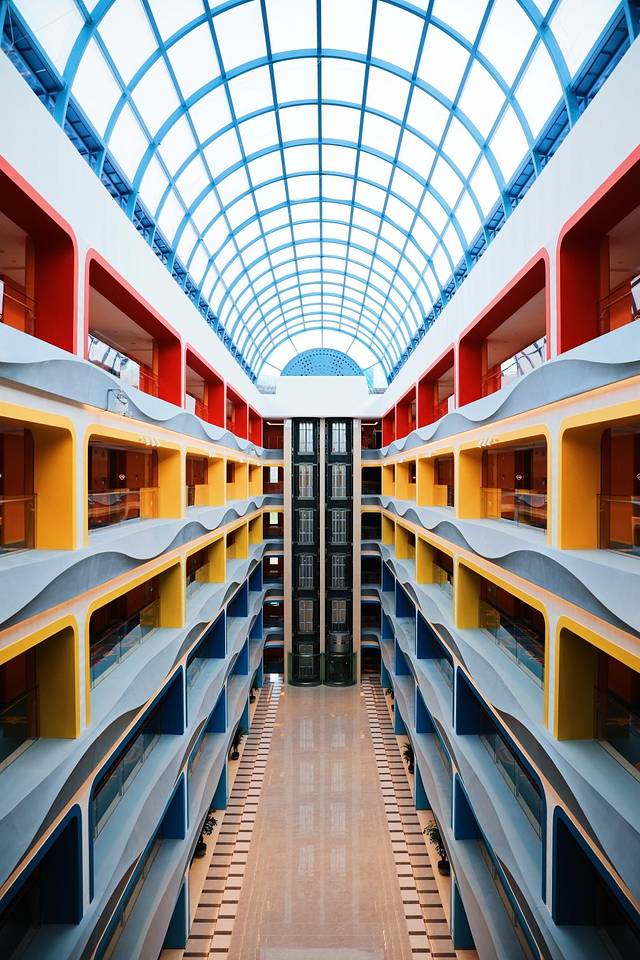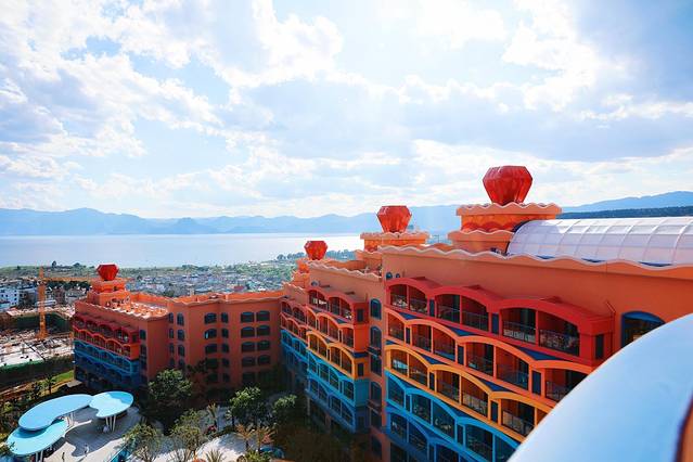 酒店坐落在抚仙湖畔寒武纪小镇欢乐大世界内,小镇在一个山崖上,乘车可以直接到达,入住以后可以从房间就俯瞰到抚仙湖的风光,非常惬意。酒店非常的醒目,整体装饰用了明艳的七彩色,在抚仙湖畔很耀眼,一踏入酒店就仿佛置身于童话世界一样,进门就有人形海豚公仔和小丑和宾客互动。