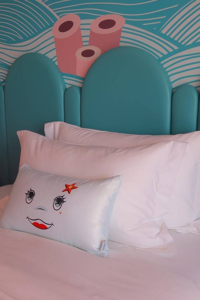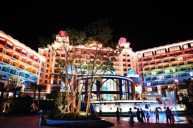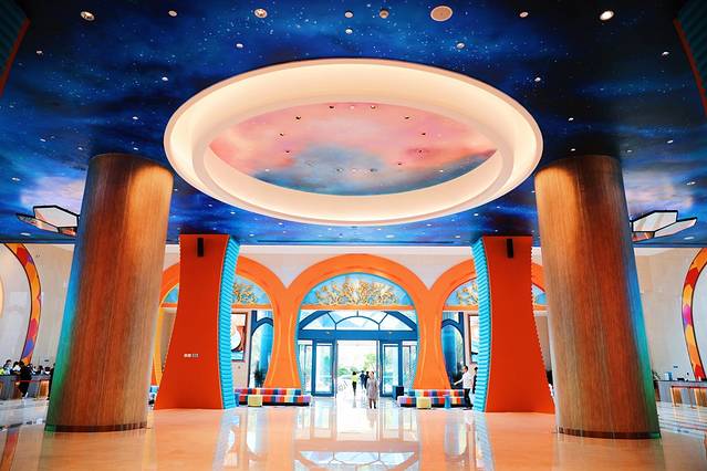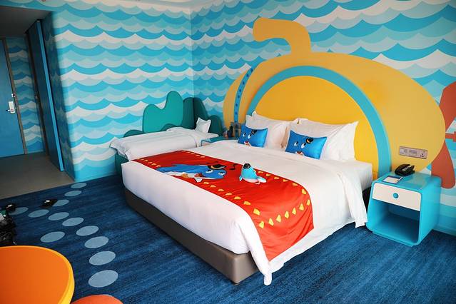 酒店房间也充满了童真,所有的装饰都围绕神秘的海底世界,床品和洁具都是很高的标准,有一个海洋主题的丝质小抱枕尤其的舒适,我甚至都想买回家了。因为是新开的酒店所有的硬件设施都很新,地毯很干净,地毯上面印制的图画也很可爱,不得不承认这家酒店真的在每一个细节都很用心。酒店房间里有一个很大的阳台,唯一美中不足的是阳台外的景观还不够美,应该是园区还在扩建的原因,听说这边在现有的化石馆、海豚馆之外目前还在扩建动物园,以后应该会更美。虽然园区在扩建但是住在酒店的这几天也没有听到装修的噪音,这点挺好的。