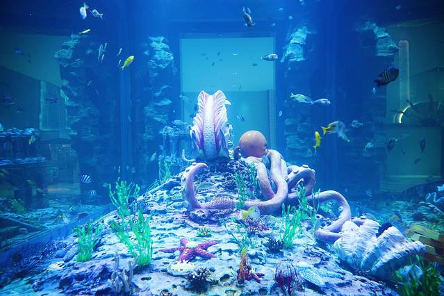 我们到酒店差不多是下午3点多,简单的在房间休息了一下,就急匆匆的去打卡水族馆了,鲨鱼、魔鬼鱼、小丑鱼还有好多我说不上名字的鱼儿,基本上在酒店逛逛我们就去吃饭了,酒店里有专门的中餐厅,厨师是广东人,给榴莲酥一个好评。