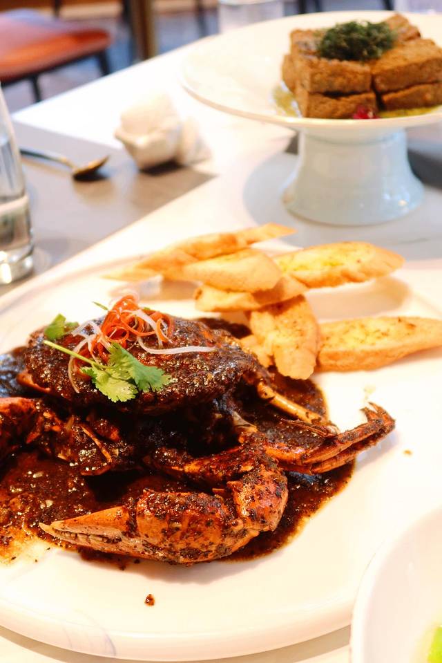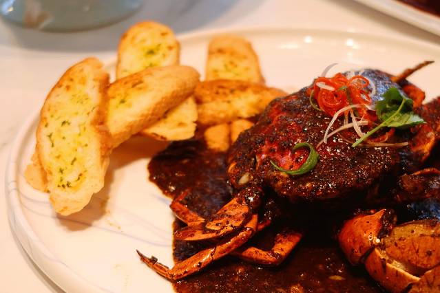 吃螃蟹的时候,可以用面包蘸着吃,这个面包有香蒜和黄油的风味,和胡椒搭配在一起真的很绝,他们家的菜都很创意。