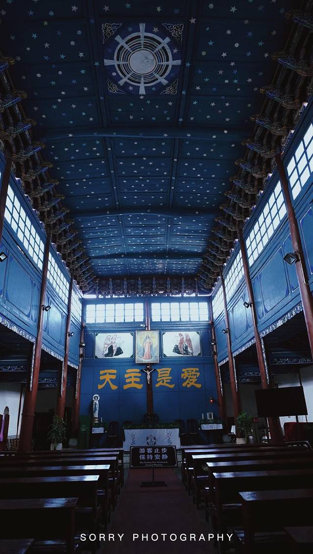 走进教堂,仿佛走进了古老的画廊和博物馆,北面墙壁布满了古老而优秀的西洋画,南面墙壁被一幅幅俊秀的中国山水水墨画所镶嵌,正面三幅画,中间一幅是教堂的微缩,记载了它的历史和风采。