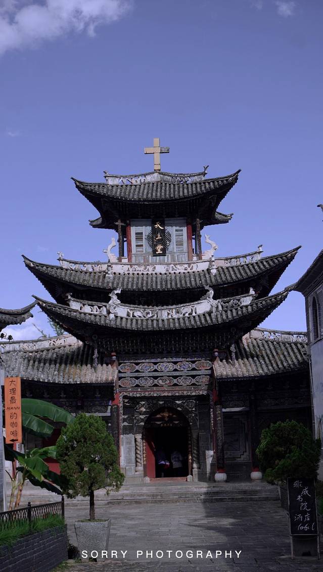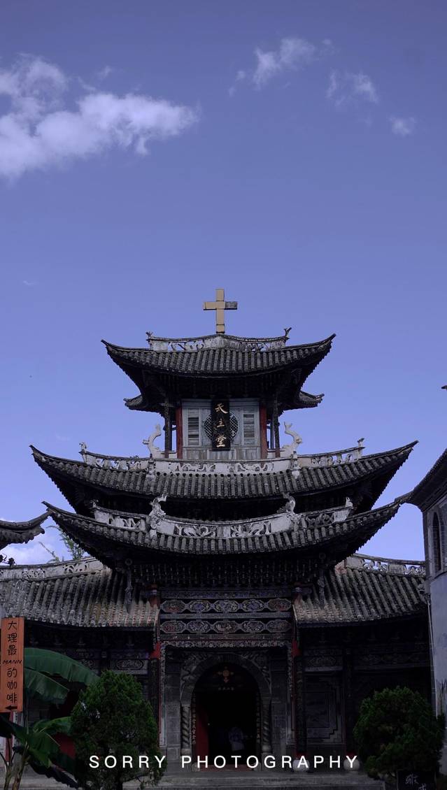 大理古城天主教堂坐落在大理古城人民路一静谧的胡同里,建于1927年。它矗立在阳光下,显得格外明显,当我们走近时完全被它迷住了。它的教堂建筑特色独一无二,是融当地白族文化特色、汉族与西方建筑及其他民族特色相融合于一身的一件民族瑰宝,飞檐斗拱,彩绘娟秀。