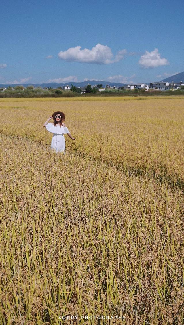 稻田是喜洲必打卡的一处,10月的澄黄明亮使得人眼前一亮,每一处都是生机盎然。阳光正好,彷佛伸手就能够触碰到云,宛若一副童话小镇的静谧与温柔画卷。
