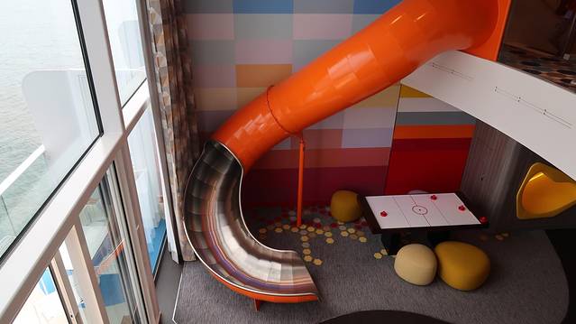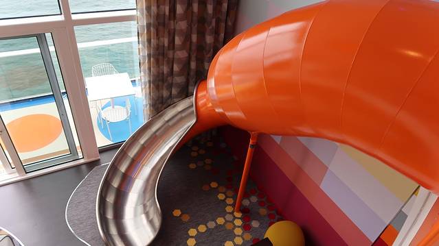 整艘游轮上最酷炫也是唯一一间占据200多平的完美家庭套房,看到这个房间的时候我简直惊呆了,完美家庭套房像是把一栋豪华别墅搬到了海上:这个套房里有巨型滑滑梯,小朋友们在房间里可以随意撒欢;
