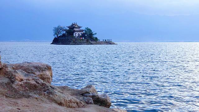 从金梭岛往北约10千米的海面上,飘着一块孤零零的礁石,其上有阁,这便是小普陀。这块礁型如方印,相传是观音大士留下的镇海之印。在洱海里,小普陀可以说是“袖珍小岛”,岛虽然小,但名气很大,在介绍大理的画册中基本都有小普陀的身影。