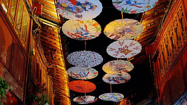 走到古城四方街,走进悠长的现文巷,就会看见巷道上空挂满了撑开的油纸伞