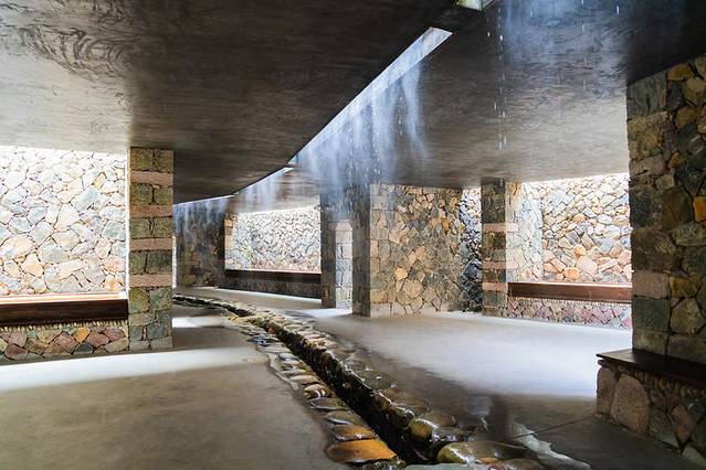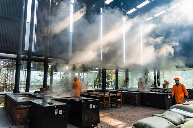 一道好的豆腐制品之所以获得人们的认可,无外两个原因,一个制作手法老道精良,二是有着优质的食材。松阳县大东坝镇蔡宅村天然的在第二个因素上占据了得天独厚的优势,蔡宅村豆腐因其独特的水质,优质的大豆,所制作的豆腐备受人们喜爱,豆腐工坊也便应运而生。蔡宅村豆腐工坊沿着直线斜坡,随山而造,旁边的溪流两岸呈现出一种有趣的空间状态,如同一个户外的公共生活的场所,但是其两侧的的建筑类型与风貌呈现出强烈的差异,一边传统,一边现代。
