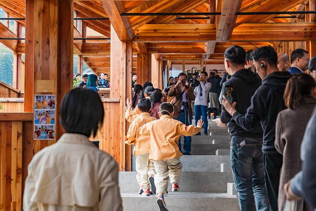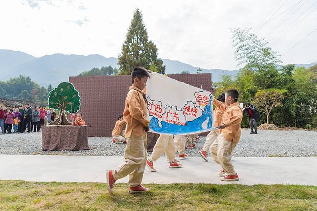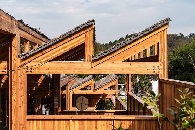 建筑南北两侧形成半围合的庭院,提示出入口所在,也和环境形成对话关系,尤其在北侧和村庄相连,共同围合出一个小型广场,作为供村民室外活动的开放场地。
