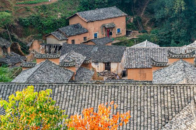 从山坡之上俯瞰陈家铺,由泥土、木板、青砖、石头筑就的民居,依照地形地貌和岩石结构的走势,沿着山崖、山坡一级级延伸,从山脚到半山,由一座座用石头搭建而起的平台托起房屋,硬生生地在山崖上辟出了一座村落。红黑色相间的瓦片下压着黄色、青色、青灰色等多种色彩,给人以强烈的视觉冲击力!