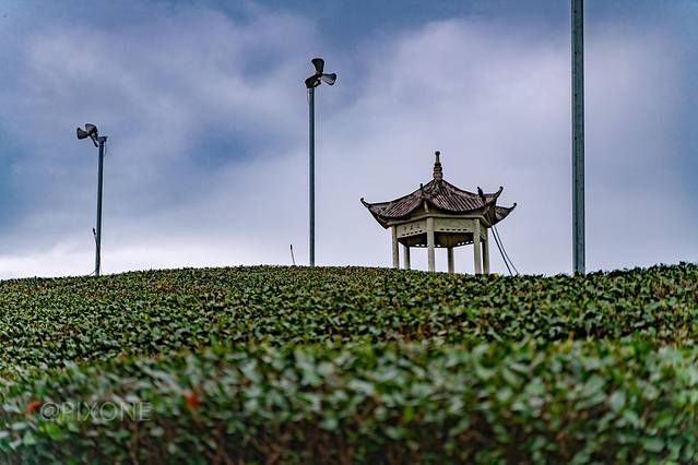 大木山茶园采用现代化的设备的来管理,比如这些个小风扇一样的杵在那儿的,是为了防止冬天的霜冻而建的,一旦感应器感知霜冻的温度后就会使空气流动起来,防止冻坏了茶叶,这可不是风力发电机哦!