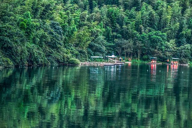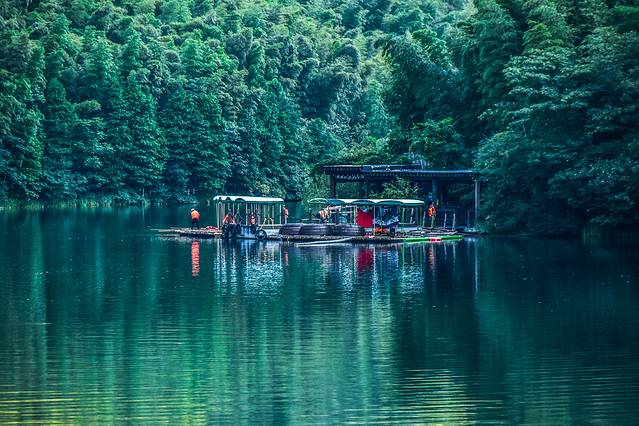 竹林深处的绿荫小道、静止的竹筏营造出绝美的生态风光,该景色用仙境来描述应该不足为过吧?当山野君看到这种竹海风光之时,还以为到了九寨沟了。虽然这不是九寨沟,却有着九寨仙境一样的既视感。你们觉得美不美?
