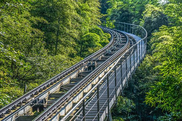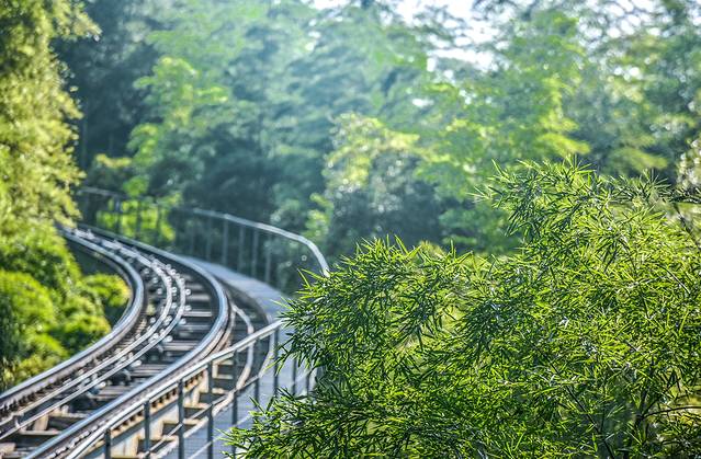 南山竹海地面铁轨是采用单向窄轨的设计,但有双向换向的部分,可以同时完成车辆相向行驶。不过,一般来说都是以单向行驶为主,只有再客流高峰期的时候才会安排双向发车。在上升过程中的体验感极好,有一种飞翔在竹海的神秘感。车辆在漫漫竹海中穿梭,这种感觉无法用语言来描述。