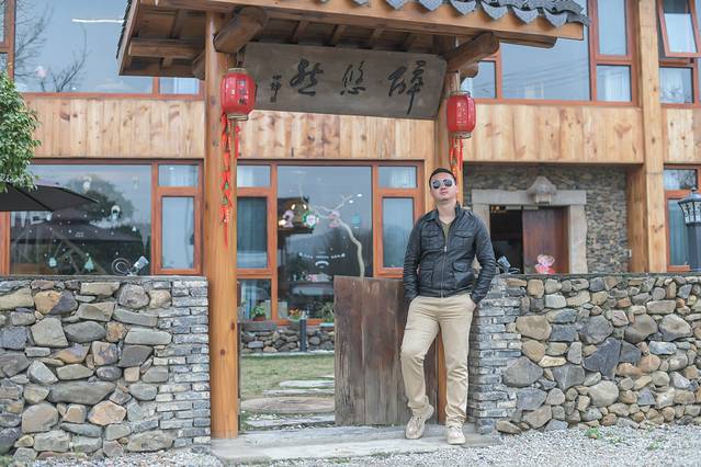 3月份的江南是一个乍暖还寒的季节,不过气候却非常宜人。早上睡醒后到大门口可欣赏下醉悠然民宿的外观格局与设计,山野君忍不住在此合影一张。
