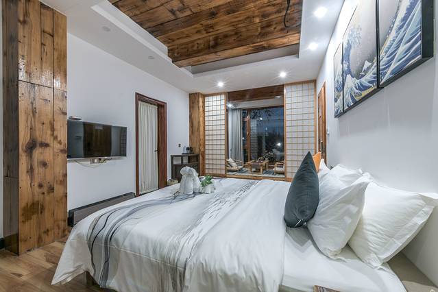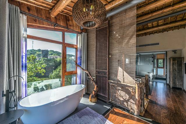 客房的整体环境超赞!浴缸与床之间有着一层竹屏风遮挡住,这种设计完全引用了传统的居家风水学。简单的使用一些屏风、不同形状的建筑,就能形成温馨、独立且睡眠极佳的卧室环境,山野君选择醉悠然果然没错!