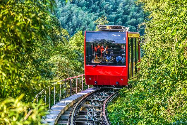 在以前从山脚下徒步到鸡鸣村则需要1个多小时,而有了地轨后上山时间压缩到1分钟左右,这个变化太神奇了。高科技改变了旅行生活,感觉是不是很爽呀?乘坐在地轨上,可以欣赏人在竹海中漂浮的感觉,这总感觉非常微妙,没想到这种地轨还有这种功能。