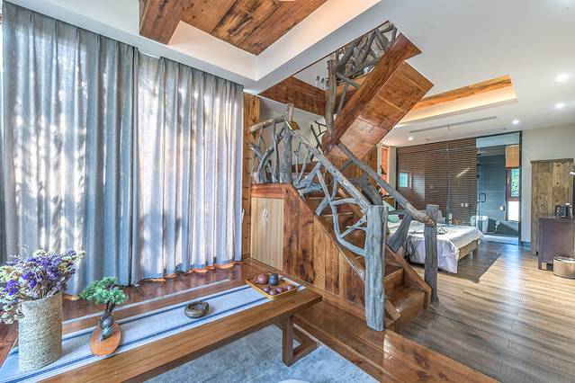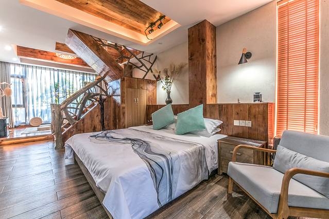 刚刚看完了房间一层的环境,现在看看二层的情况吧。从木质楼梯上来后给人一种别有洞天的感觉,这种环境与一层完全相似,但却有着说不出的不一样格调。大概是楼层高低带来的视觉效果吧?与一层房间一样,面积大却气场十足、格调高雅却不失民宿气息,这种民宿真的太棒了。