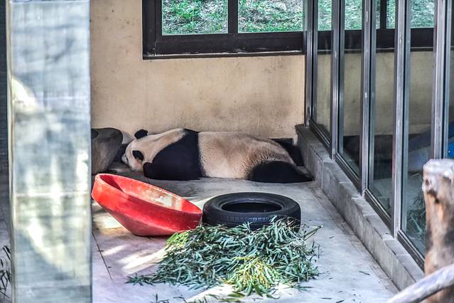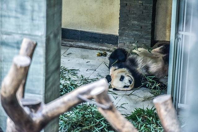 山野君的运气还是比较不错的,看到室内有一只在它们家门口的熊猫懒洋洋的熟睡了,当时并不是能看得很清楚,不过好在我带有70-200长焦镜头,所以终于通过拍照看到了这些可爱的国宝。