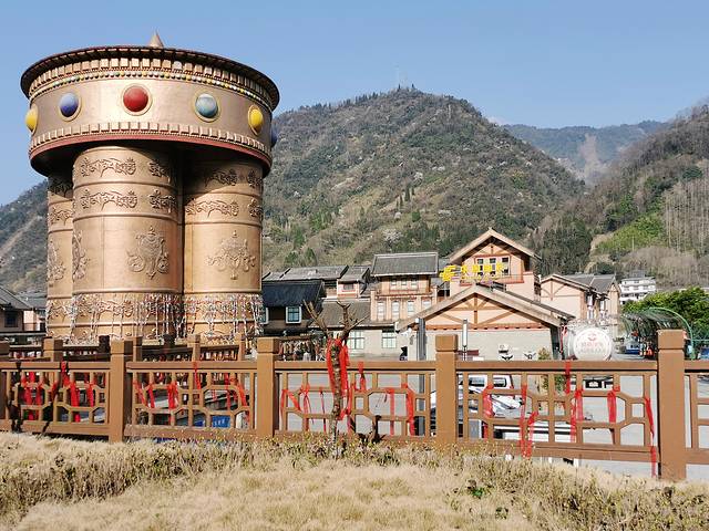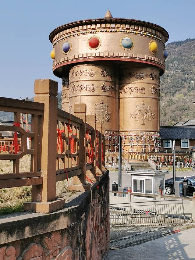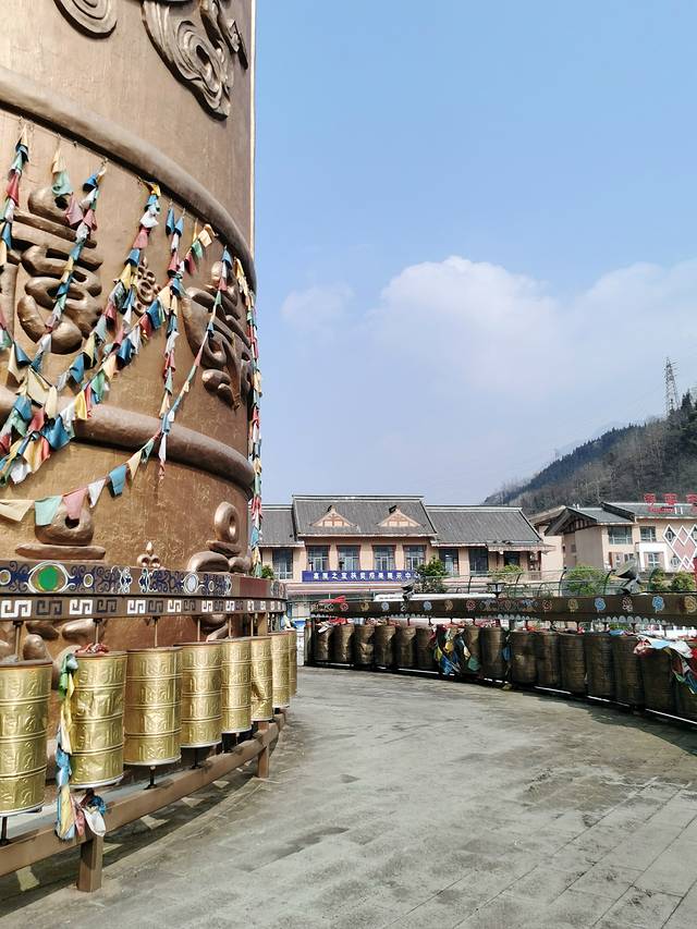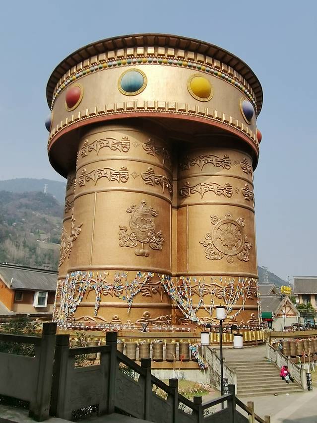 从景区入口看到转经轮广场,巨大的转经轮造型据说是亚洲最大的。