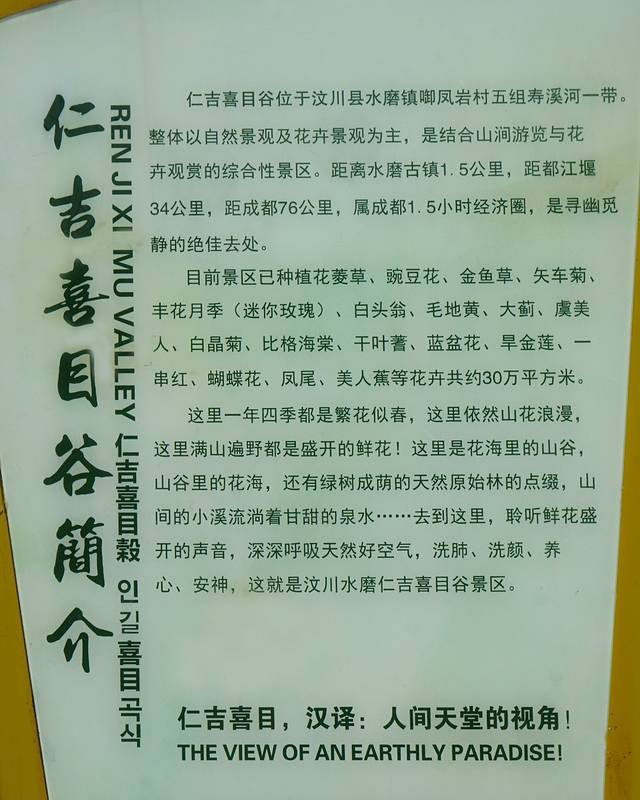 仁吉喜目是个地名,位于四川汶川水磨古镇旁边的一条美丽的山谷中,后面是盘龙山,景区范围约30万平方米,以自然景观与符合当地植被的花卉景观为主,结合山涧游览与花卉观赏的综合性景区,并构成了国家AAAAA级汶川特别旅游景区的重要组成部分。仁吉喜目,汉意“天堂的视角”,从字面上看,“仁吉”为仁爱、吉祥之意,“喜目”即“喜眉笑目”或“眉开眼笑”之意,藏人发自内心笑赞这条美丽山谷的大仁大吉。你任何一个季节来,都可观赏山谷的鲜花,享受神明带来的仁爱吉祥。我曾几次造访水磨古镇,途径仁吉喜目谷,离古镇不过1.5公里的距离。今乘春节后的空闲日子来此一游,也许这还不是鲜花盛开的季节,但天好,不冷不热,游人又少,踏行盘龙山,在观赏花卉的同时,把这一行当成是一种踏春活动,既观赏山谷的鲜花,又享受了仁爱吉祥之意不也是挺好的吗?