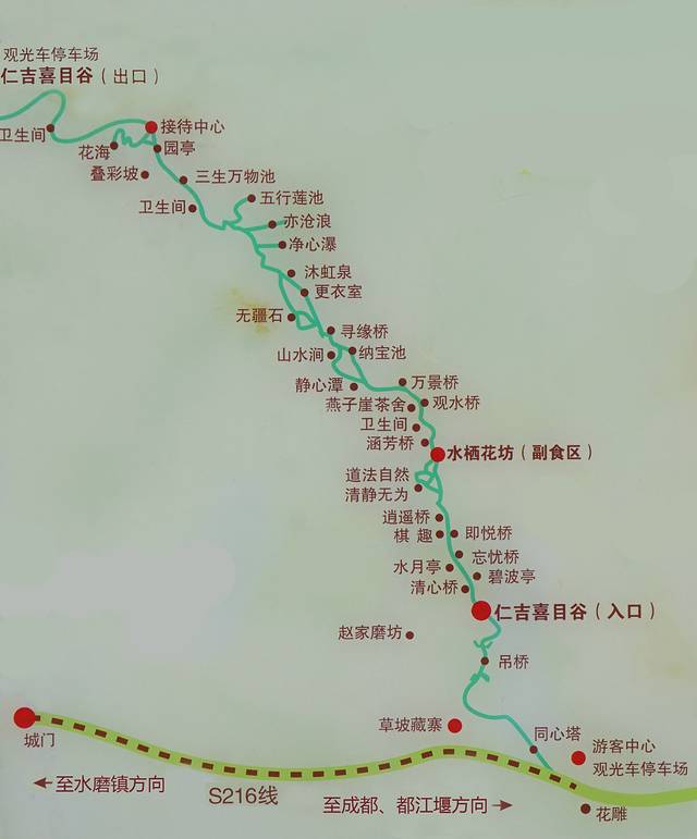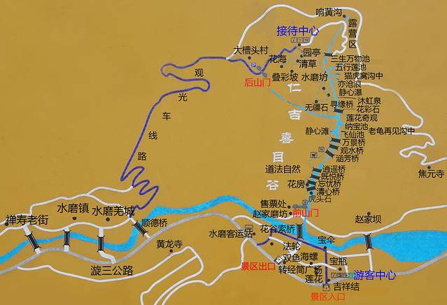 把地图拍下重新画过,水平方向浅蓝色标注了岷江支流的寿溪河,垂直向上就是仁吉喜目谷,谷中潺潺溪水流入寿溪河,谷边标注了景点名称,大多为桥、池、石、沟之类的自然景观。游山谷有两个走法,一是徒步上下,从寿溪河旁的前山门进去,登到最高处再沿路返回,二是在景区入口的游客中心花20元钱乘观光车西行,沿顺德桥跨过寿溪河北上盘龙山,直抵后山门,然后徒步下山游玩。我问过后选了前者,上下不过两、三个小时,不累,也正好可以仔细细细观赏、慢慢品味。