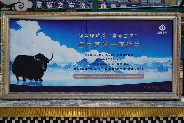 房前并排竖着两幅画,一幅是说牦牛被称为“高原之舟”,是世界唯一源种牛。