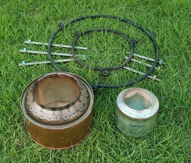 利用好友提供的茶叶罐,再捣弄个大的酒精炉,足够大的火力,可以用于铁锅烧菜