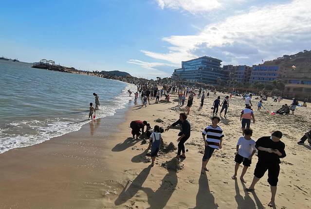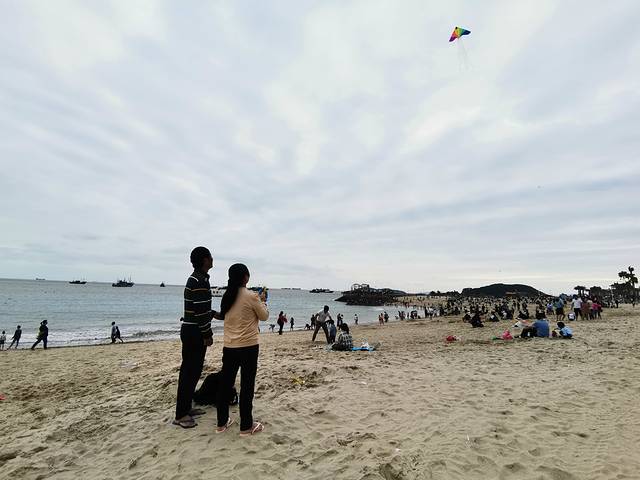 风筝下方,沙滩上游人如织,挖沙坑的戏水的,热闹非凡