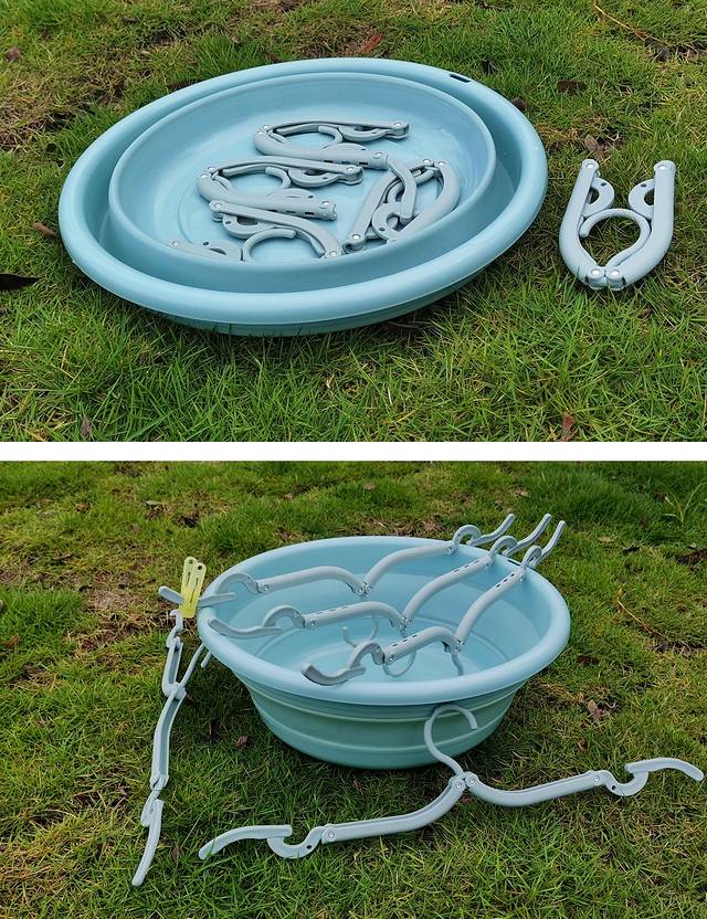 继续完善出行装备,添加了特大号折叠脸盆(直径37cm,用来洗头洗衣物),折叠晒衣架