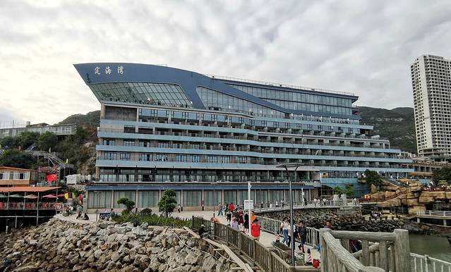 耸立在海岸边的山海运动小镇的游客中心,其外形酷似游轮,高达九层,淡蓝色玻璃外墙与蔚蓝色海水堪称完美