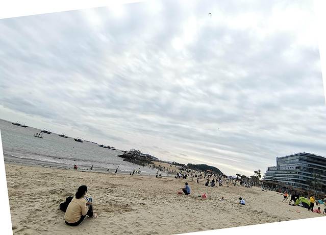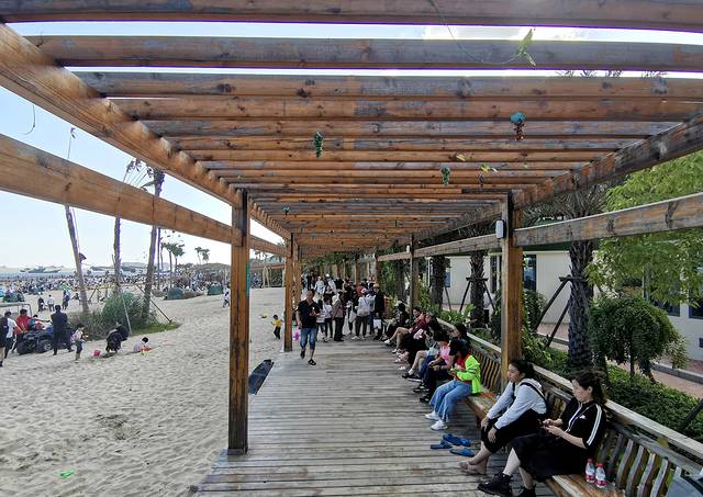 从欢乐大舞台走向沙滩,长廊下几乎坐满了休息的游客
