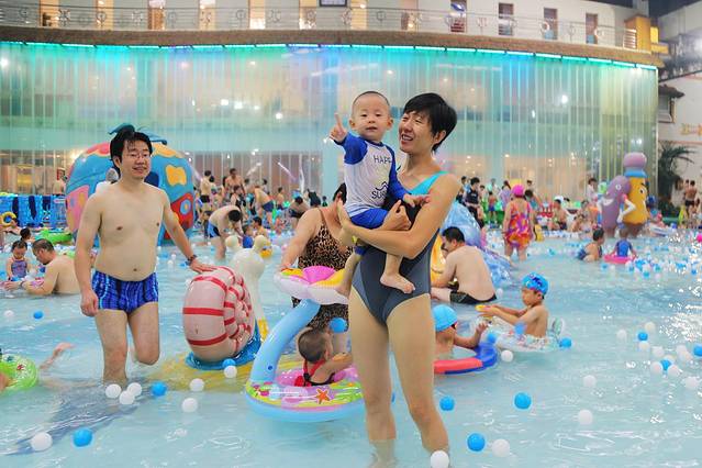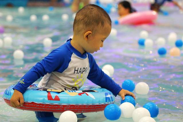 对于一岁半的瞧瞧来说,南宫温泉水世界的儿童戏水池最适合他。池水不深,套着泳圈能自由走动,水是温热的,小宝宝刚下水时在这里适应一下再好不过。儿童戏水池里有小滑梯、海洋球,喷水的大型花洒,属于较温和的戏水设施,一岁多的宝宝玩起来也丝毫不用担心。