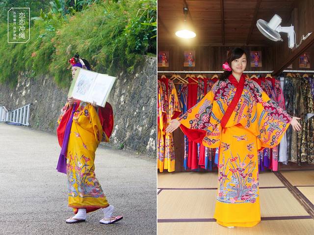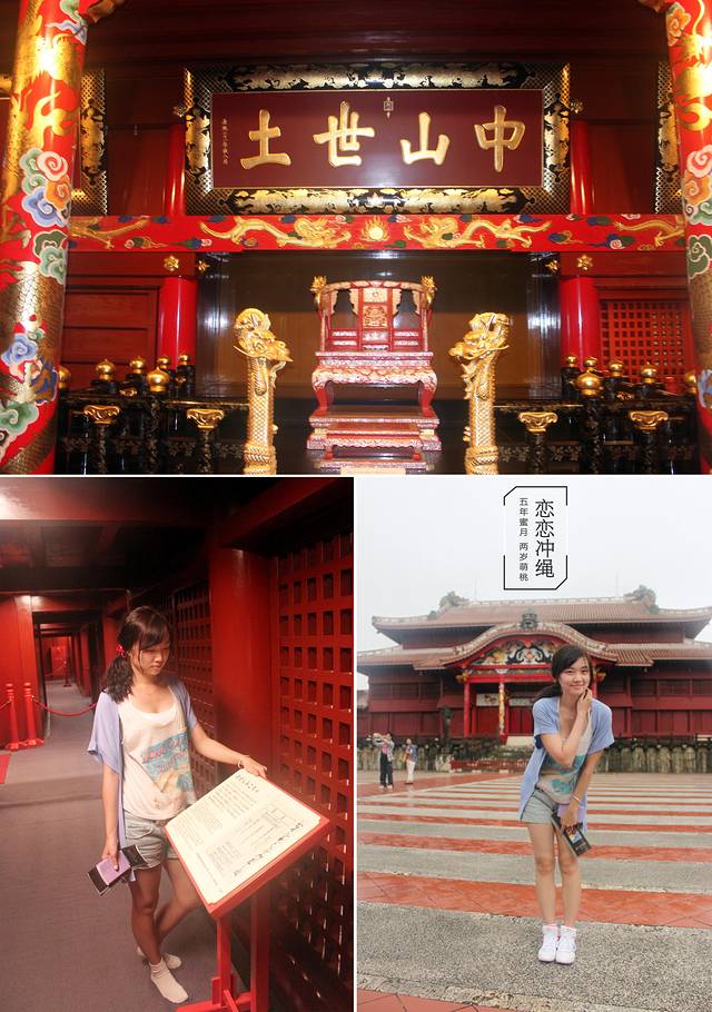 首里城里有冲绳的民族服装可以cosplay一下,和传统和服不同,更像是和服和清朝服饰的综合体,萌妈妈当面选的是黄色的, 因为人家说黄色代表皇后,其他颜色代表妃子,好吧,要当就当正宫娘娘酷!
