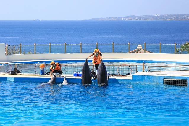 海洋馆共有四个区,除了主水族箱“黑潮之海”之外,第一个重头戏就是海豚馆的海豚表演,我们紧赶慢赶,终于赶上了1点开始的表演,可是因为人满为患,爸爸和桃妈妈和桃桃只能分开观赏了捂脸小蜂
