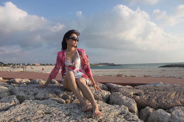 萌小步妈妈换上一套复古泳衣, 享受一下温暖的阳光、蔚蓝的大海