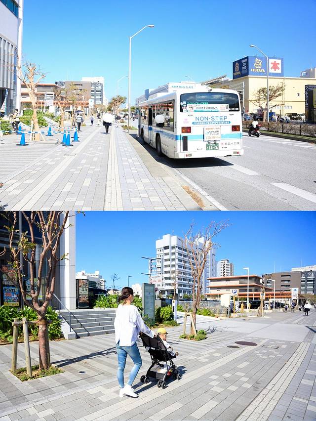 带着孩子的亲上车时完全不用着急,冲绳的公交车都会特别贴心的等着你把孩子、婴儿车一切安置就绪之后才启动的,上车的时候你会拿到一个标有站点的车票,等后续下车的时候对照站点付费就可以了。美国村下车的站点叫军医院站,车费大概650日元左右。