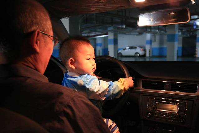 坐在后座上一直不老实,偏要向前坐,好吧,爷爷让你感受一下方向盘吧,估计你现在应该已经能开车了吧?也不知道爸爸是不是一辈子都不敢开车呢?