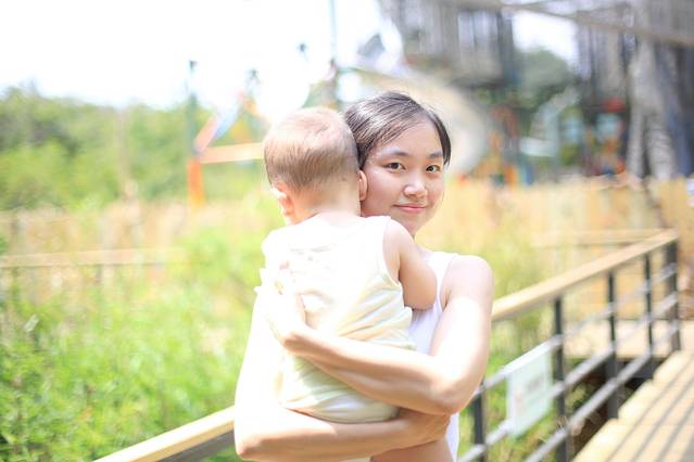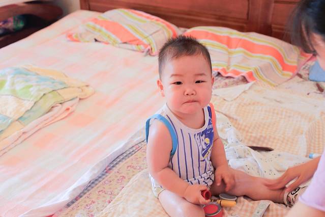 怕你这个小胖子晒黑了,看妈妈在你脸上抹了多少东西,抹就抹呗,还不给你抹均匀了,哈哈!