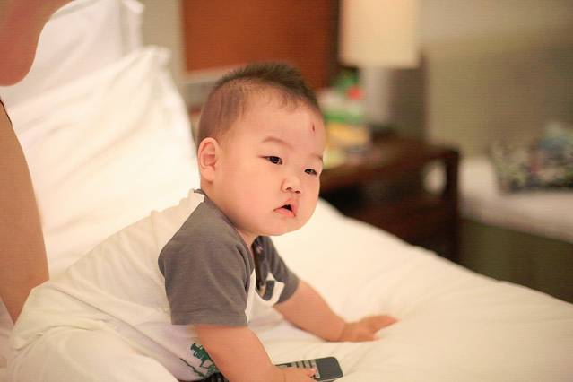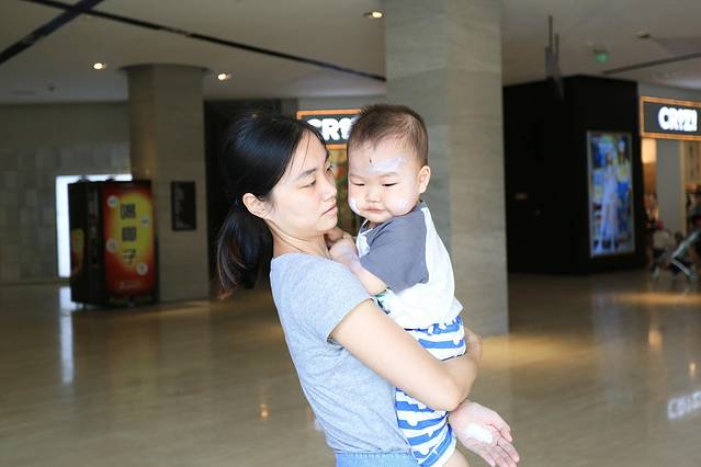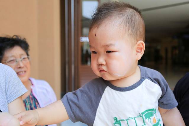 玩得差不多了,胖桃子你高兴的跟着爸爸妈妈回房休息,可不巧的时候你太兴奋,加上爸爸妈妈一个不注意,你滑倒撞在了墙边的金属围栏上,头上立刻就鼓出了一个大包,伴随着你撕心裂肺的哭声,可把我们给吓坏了。当时你头上的大包鼓出好高,妈妈赶紧哄你,爸爸给你要来了酒精,还好没过多一会儿,肿包就消下去了不少,你也停止了哭喊。爸爸妈妈才稍微放下心了一点。